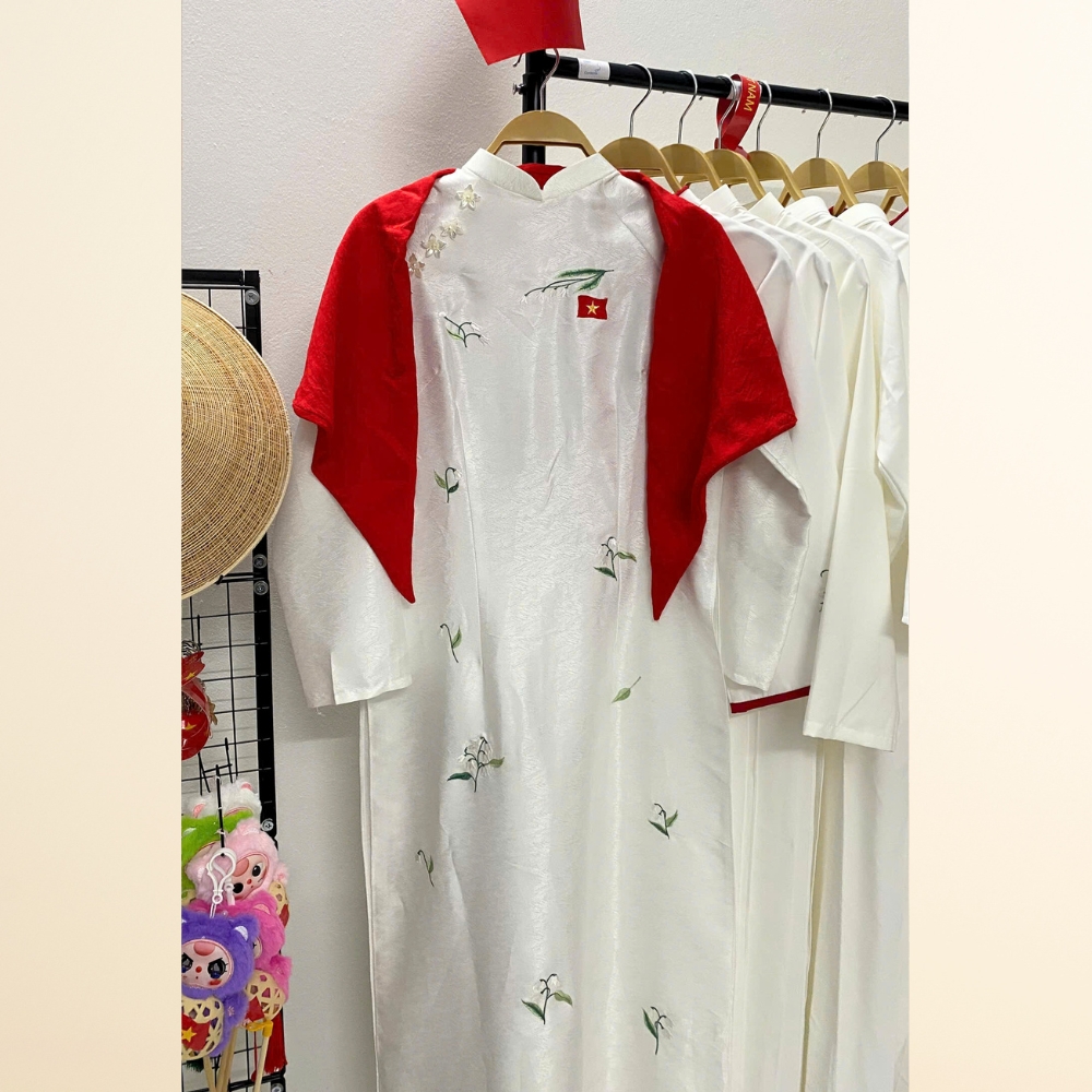 ÁO DÀI YÊU NƯỚC GẤM THÊU LÁ CỜ ĐỎ SAO VÀNG 2 TÀ: